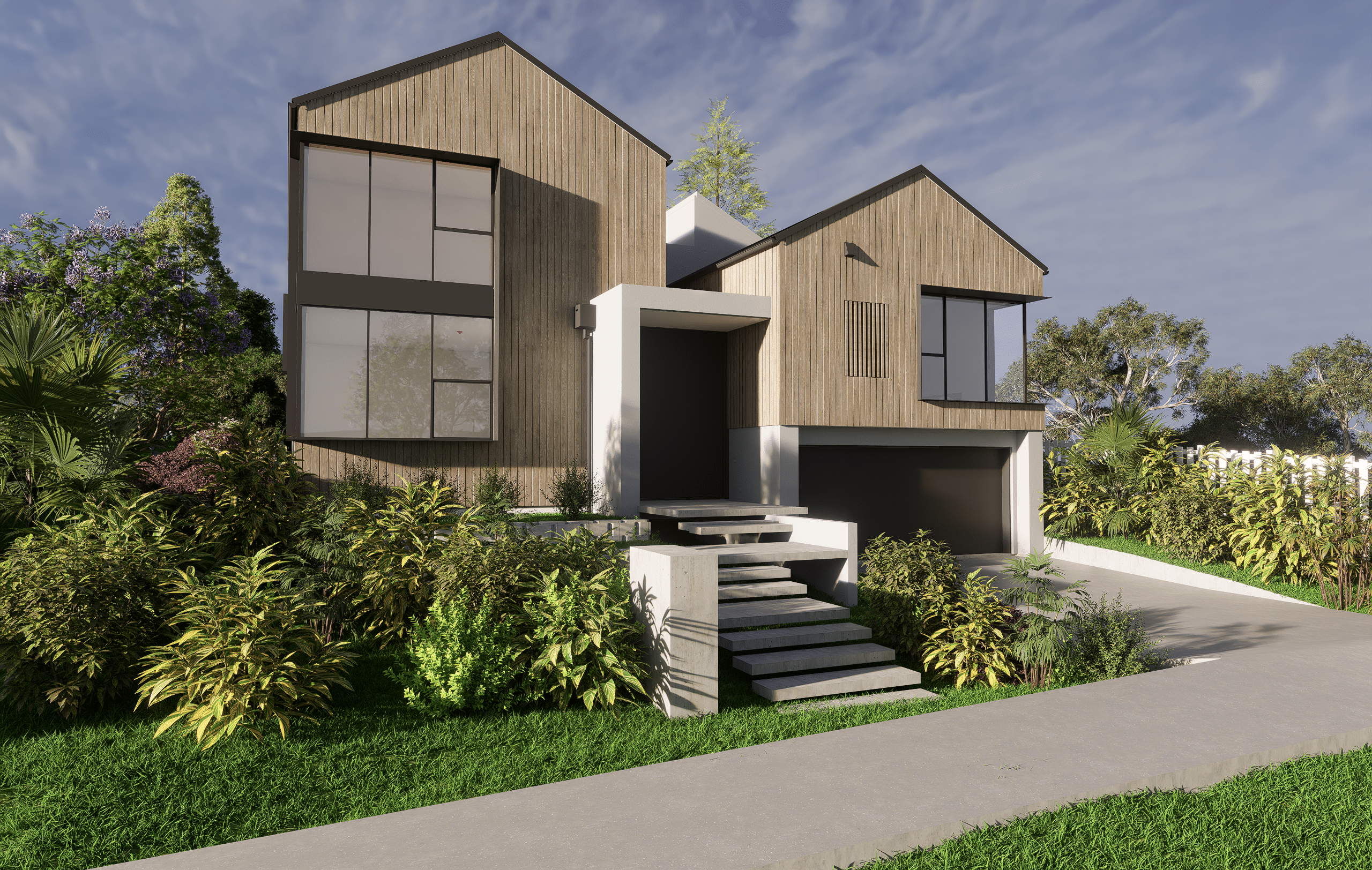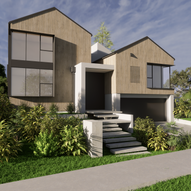 A bold interplay of natural textures and clean geometry, this contemporary residence balances warmth and strength through vertical timber cladding and sleek concrete forms.