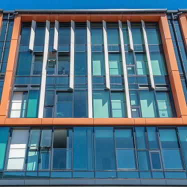 A curtain wall cladding system encloses the balconies, expanding living spaces and the overall floor plan of each unit. The curtain wall is framed by new protruding fin additions providing a modern form and visual interest to the building, accentuated by colour.